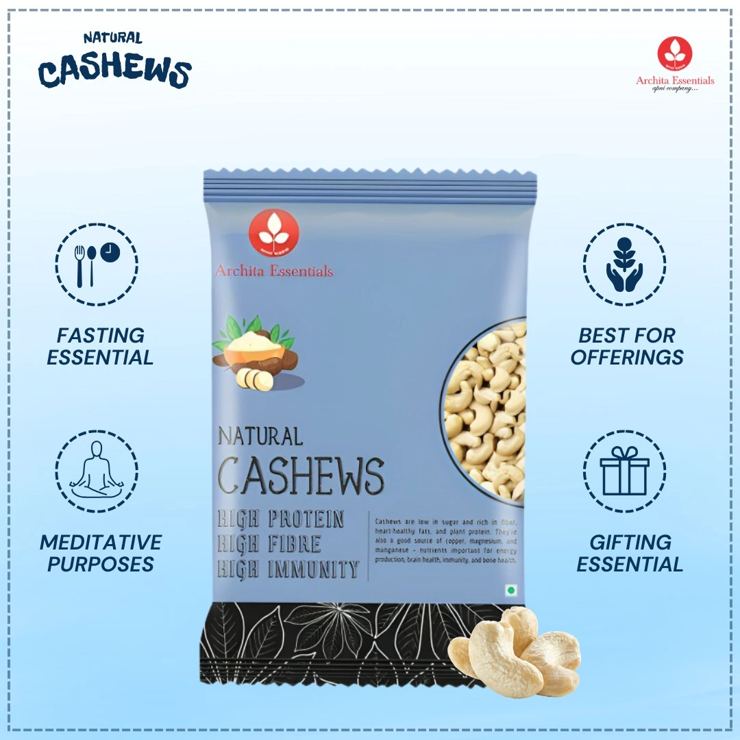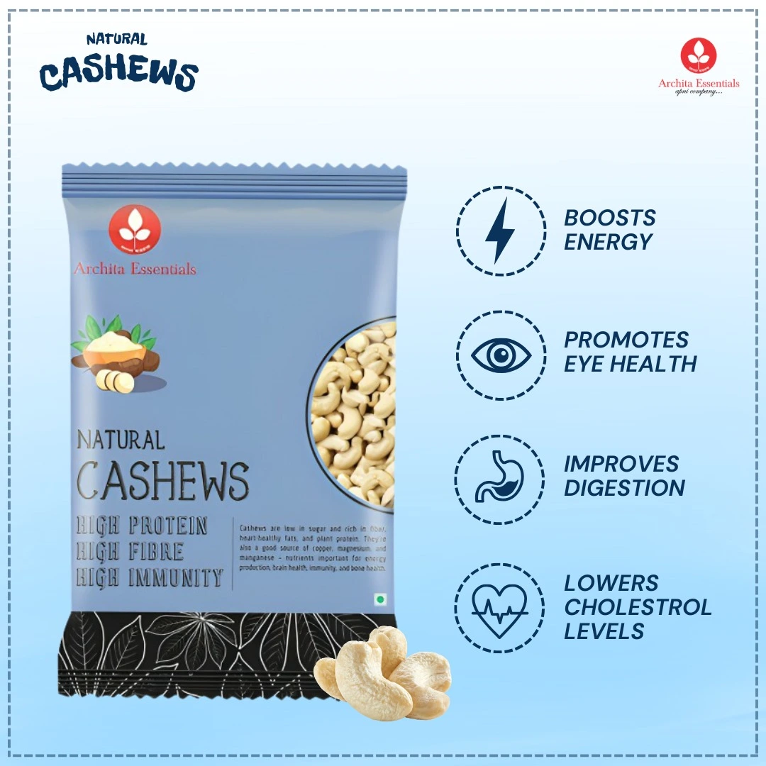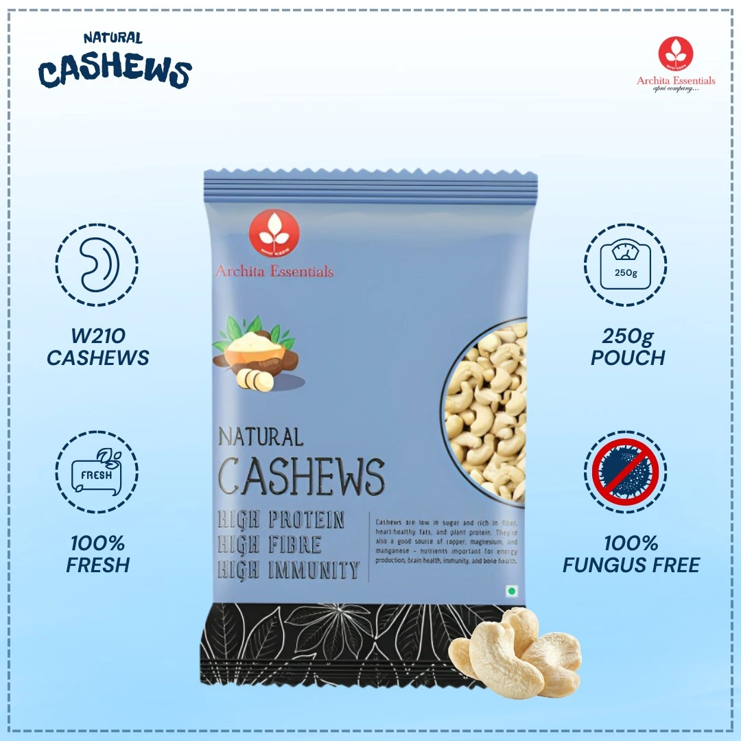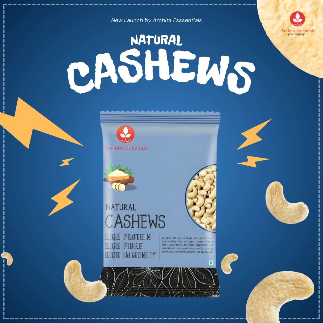 Archita Essentials offers Natural Cashews(Kaju) with a nutritious and tasty crunch. These excellent cashews are hand-picked and hygienically packaged for nibbling, gifting, and enriching cookery. Experience nature’s clean, rich, and gratifying goodness in every mouthful.