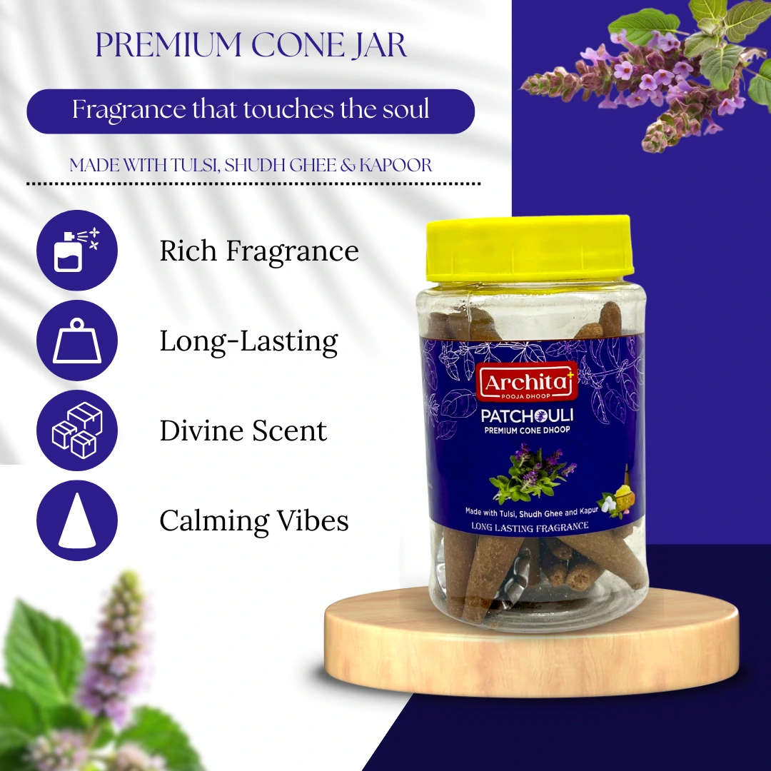 A newly introduced sensory pleasure, Archita Poojabatti Premium Patchouli Dhoop Cones beckon you to enjoy the ageless, grounded scent of patchouli. Renowned for its rich, musky scent, this brown dhoop cone is ideal for improving concentration, spiritual balance, and air cleaning. Kept in a tidy cone jar, it offers continuous quality and freshness.