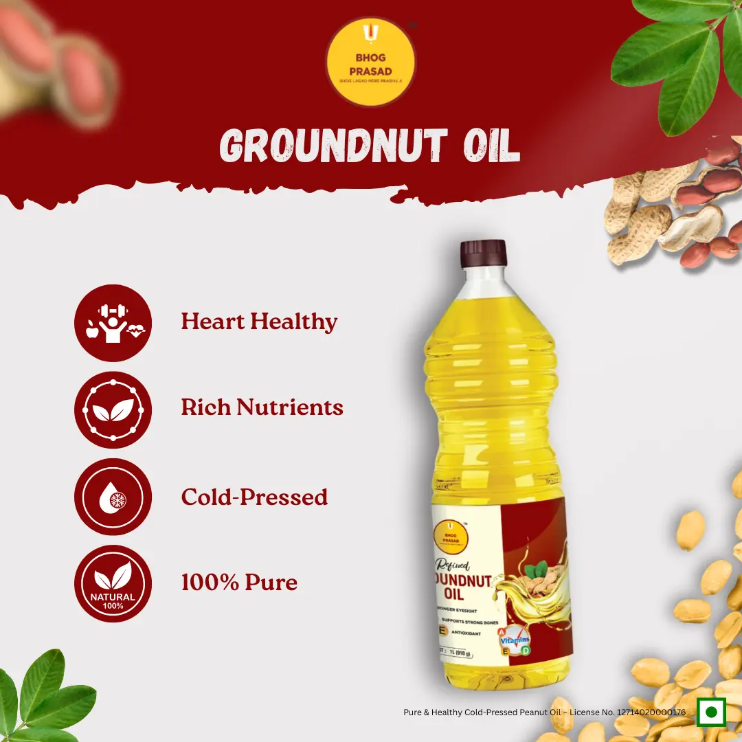 Bhog Prasad presents Pure & Natural Groundnut Oil that has been meticulously extracted using a traditional cold-press method from premium quality groundnuts. This oil is perfect for everyday cooking and prasad preparation because it maintains its authentic taste, nutrients, and natural aroma. It ensures that every meal is pure, nourishing, and heartfully fulfilling because it is high in protein, antioxidants, and healthy fats.