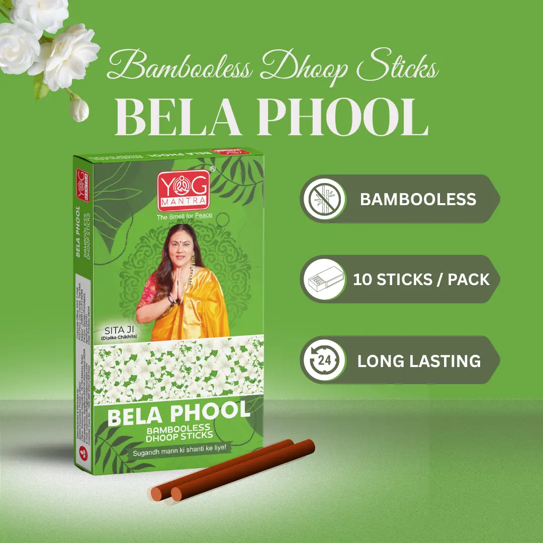 Presenting the classic beauty of Indian flower scent with YogMantra Bela Phool Bamboooless Dhoop Sticks. Perfect for anyone who want heavenly aroma in their daily routines, these organically made dhoop sticks. These dhoopsticks, made with 100% natural materials and the soulful scent of bela flowers, provide a calm, spiritual atmosphere with every burn.