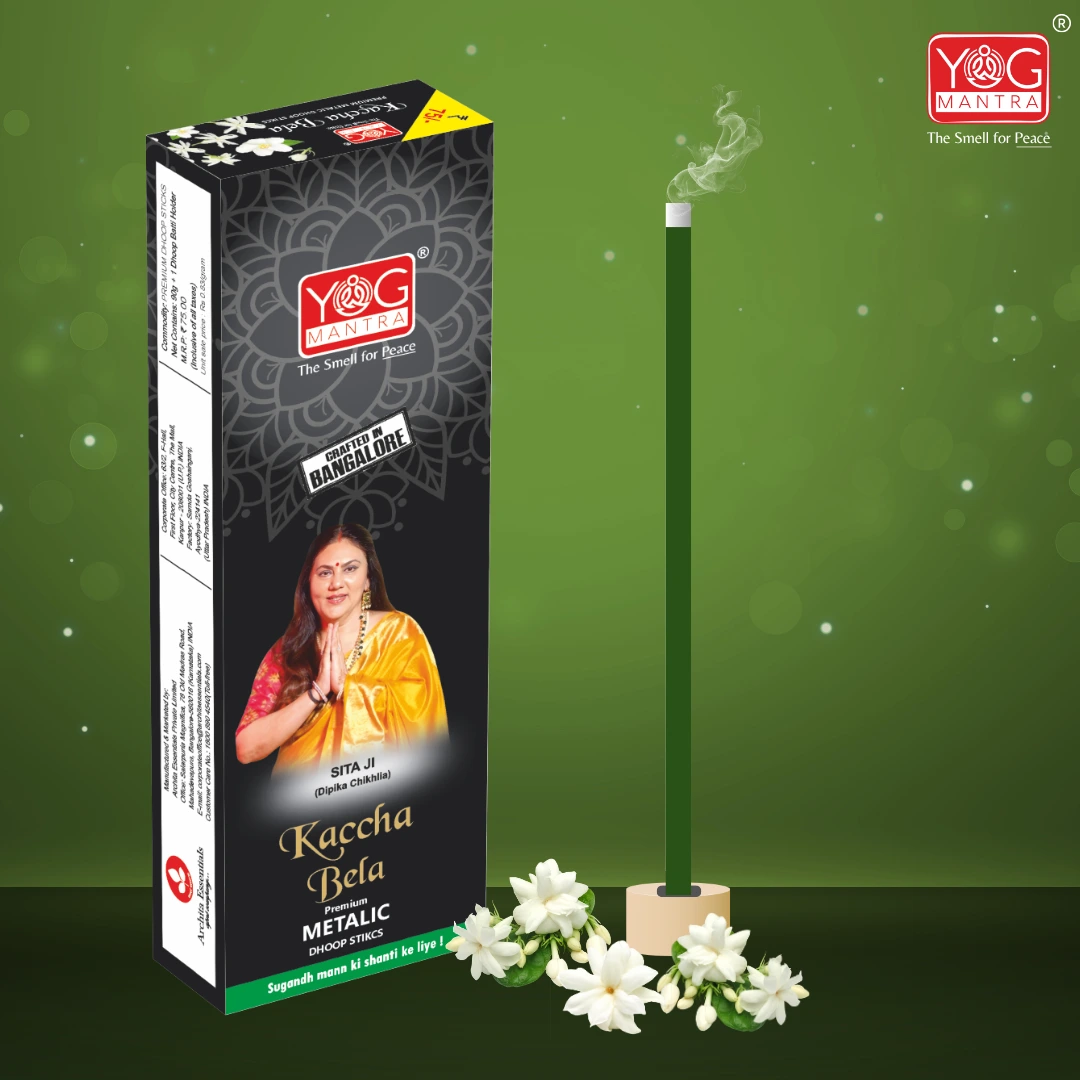 As a part of Yog Mantra Metallic Series Kacha Bela provides pure bela flower scent picked directly from the garden through each stick. You can experience a clean invigorating aroma from these thick green metallic dhoopsticks, which create a perfect environment for your relaxation practices both during your rituals and throughout your periods of reflection and daily mindfulness. These dhoopsticks create a peaceful doubtless atmosphere for rituals and meditation practice.